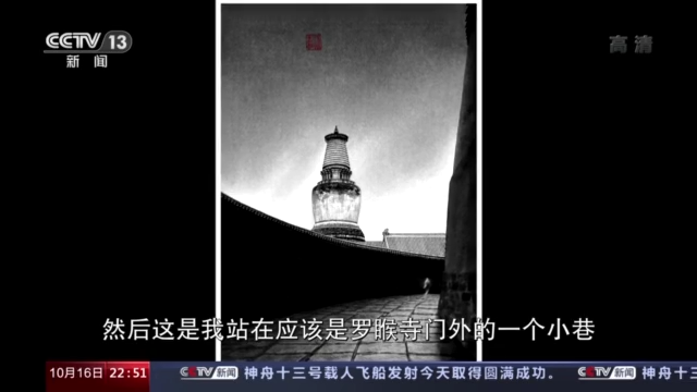 刘凯:这幅画取材于忻州五台山的大白塔,然后我站在罗睺寺门外的一个小巷。每一幅画里面都有这样一个人物,初衷都是说我自己在那儿仰望它,在那儿凝视它。你好像在和它的建造者说话,或者说你在和它曾经赞叹过它的人,跨时空地产生了一种共鸣。那些已经消逝的古建筑,我们现在有很多只能从旧照片里面去看它们。那如果没有旧照片,或者说连这样一篇辞赋都没有的时候,你只能通过一些历史史料记载,通过自己的想象去观察它们。所以说我们目前保存下来了这么多的建筑,以后时间还长,山西古建我肯定都要跑遍,在家里慢慢画。我画画也不是讲求数量的,我不辜负我画的每一幅画和它背后的古建筑的身份。