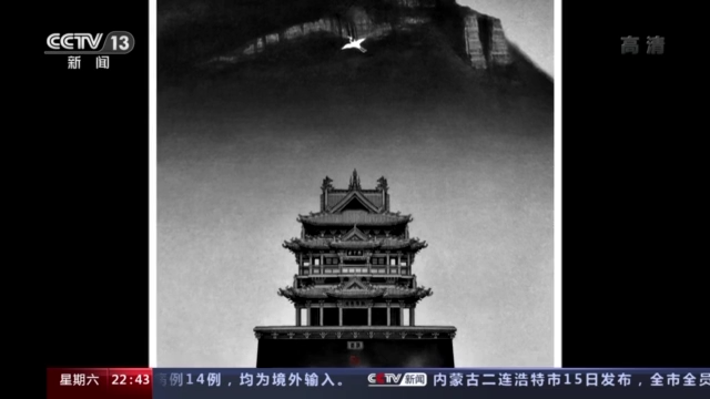 刘凯:这幅画画的是临汾霍州的鼓楼,上面是我们太行山的山势,虚空中有一个骑鹤的人,戴着一个古人的那种冠,就很庄子逍遥游的感觉。像这种古建筑你进去的话,就觉得它好像开天辟地的存在,不觉得会有什么不妥。这种黑白色调,让你觉得很朴素、很纯净。我作为一个山西人,就是我要把我眼中的那些古建筑画出来。新闻上说山西有1700多处古建筑都受损了,我想让大家多关注这个事情。