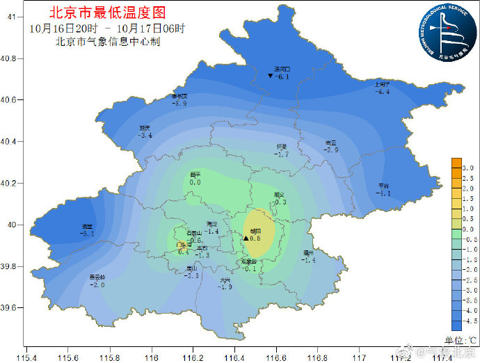 受寒潮天气影响,今晨北京很多地方最低气温首次跌破0℃。截至早晨6点,观象台最低气温为-0.1℃,出现在4点48分,为观象台站1969年以来10月中旬同期最低值。