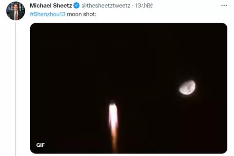 伴月画面也引起另一名美国航天专业记者的共鸣。从神舟十三号点火升空到进入太空轨道,美国全国广播公司商业频道(CNBC)的记者迈克尔·希茨全程关注,并在社交媒体连发多条帖文实时介绍。对于直播画面中火箭伴月的浪漫一幕,他则特意晒出动图,并诙谐地写道,“神舟十三号‘登月’”。