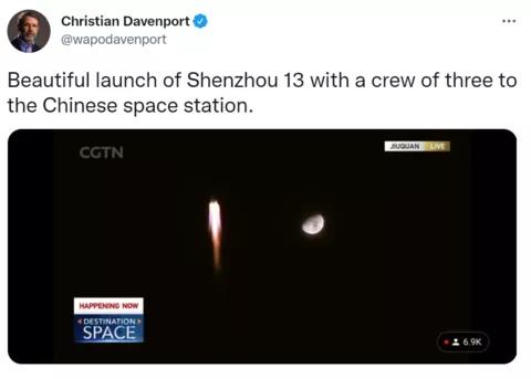 克里斯蒂安·戴文波特是一名《华盛顿邮报》航天新闻报道领域的专业记者,他第一时间在社交媒体发布了总台CGTN直播中神舟十三号伴月的画面,称赞道,“搭载3名航天员的神舟十三号完成了漂亮的发射,奔赴中国空间站。”