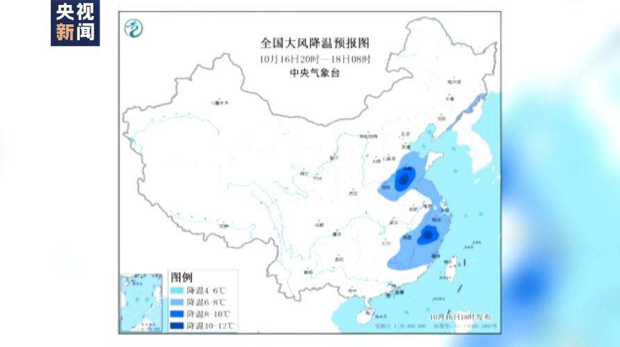 中央气象台继续发布寒潮蓝色预警。受强冷空气影响,今天(17日)至明早(18日)8时,辽宁东部、吉林东部、黄淮、江淮东部、江南中东部等地的部分地区将有大风降温天气;辽宁东部、吉林东部、黄淮大部、江淮东部、江南东部、广东东北部等地气温下降6~10℃,其中,山东、浙江、福建等地部分地区降温10℃以上。