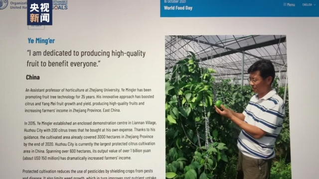 粮农组织今年评选出25个个人或团体粮食英雄,呼吁推动农业粮食体系转型,不让任何人掉队。其中,浙江大学园艺学副教授叶明儿因35年如一日、兢兢业业推广果树技术而获得粮食英雄称号。