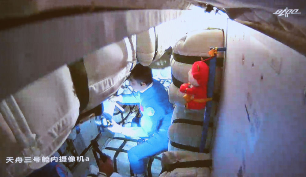 ↑10月17日在北京航天飞行控制中心拍摄的神舟十三号航天员乘组进入天舟三号货运飞船的画面。