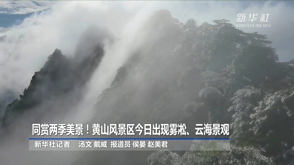 【#黄山一日集齐雾凇云海两奇观#】受冷空气的影响,17日清晨,黄山风景区出现了少量雾凇,沿途的黄山松被雾凇包裹,松针结上白霜。继黄山出现雾凇景观后,上午9时左右,黄山之巅再迎壮观云海景观,白茫茫的海浪在山间波涛汹涌,好似仙境一般,亦秋亦冬的风景让游客惊喜连连。 新华社的微博视频