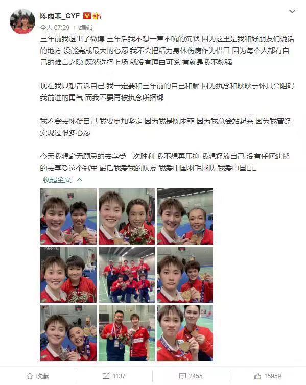 陈雨菲更新道:现在我只想告诉自己,我一定要和三年前的自己和解,因为执念和耿耿于怀只会阻碍我前进的勇气,而我不要再被执念所捆绑。我不会去怀疑自己,我要更加坚定。因为我是陈雨菲,因为我总会站起来,因为我曾经实现过很多心愿。今天我想毫无顾忌的去享受一次胜利,我不想再压抑,我想释放自己,没有任何遗憾的去享受这个冠军。
