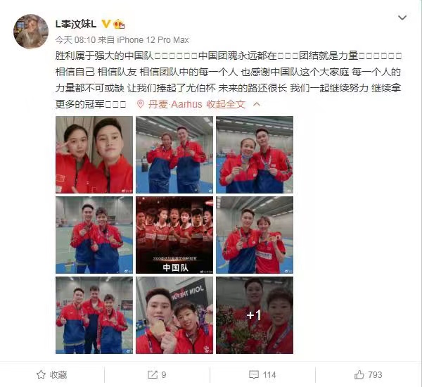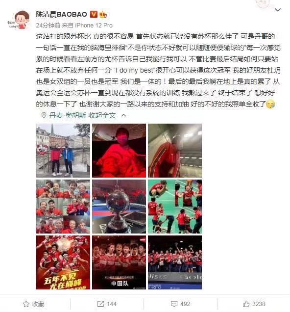 北京时间今天凌晨,尤伯杯羽毛球团体赛决赛展开争夺,中国队在先失一分的情况下,连扳三场,最终以3-1战胜日本队,第15次捧起尤伯杯。赛后国羽队员们在社交媒体上纷纷更新状态,分享了各自胜利的喜悦。