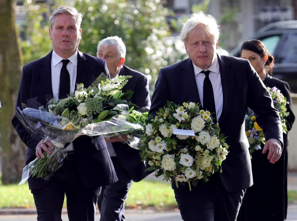 10月16日,英国首相、保守党领袖鲍里斯·约翰逊(前右)、工党领袖斯塔默(前左)来到英国埃塞克斯郡滨海利献花,悼念遇刺身亡的英国保守党议员戴维·阿梅斯。(新华社发,英国首相府供图)