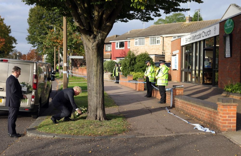 10月16日,英国首相、保守党领袖鲍里斯·约翰逊(左二)、工党领袖斯塔默(左一)来到英国埃塞克斯郡滨海利献花,悼念遇刺身亡的英国保守党议员戴维·阿梅斯。(新华社发,英国首相府供图)