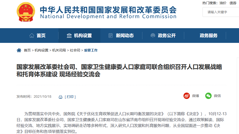 央视网消息:据国家发改委网站10月18日消息,为贯彻落实中共中央、国务院《关于优化生育政策促进人口长期均衡发展的决定》(以下简称《决定》),10月12-13日,国家发展改革委社会司、国家卫生健康委人口家庭司在山东省济南市组织召开现场经验交流会,通过政策解读、国际经验交流、地方实践展示、实地调研走访等多种形式,深入研究人口发展和托育服务问题,从全国层面进一步推动《决定》目标任务和各项举措落实到位。