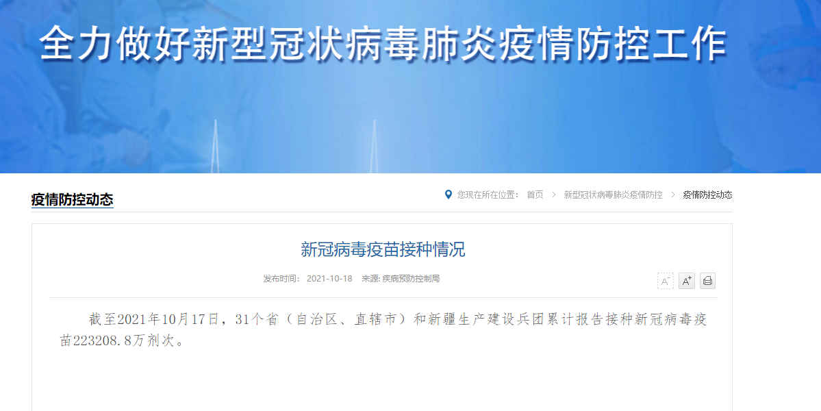 截至2021年10月17日,31个省(自治区、直辖市)和新疆生产建设兵团累计报告接种新冠病毒疫苗223208.8万剂次。