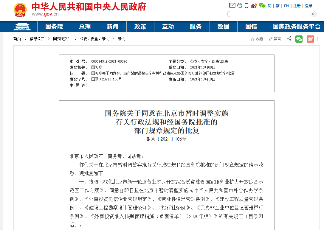 央视网消息:据中国政府网消息,国务院同意自即日起在北京市暂时调整实施《中华人民共和国中外合作办学条例》、《外商投资电信企业管理规定》、《营业性演出管理条例》、《建设工程质量管理条例》、《建设工程勘察设计管理条例》、《旅行社条例》、《民办非企业单位登记管理暂行条例》、《外商投资准入特别管理措施(负面清单)(2020年版)》的有关规定。国务院将根据深化北京市新一轮服务业扩大开放综合试点建设国家服务业扩大开放综合示范区工作情况,适时对本批复的内容进行调整。