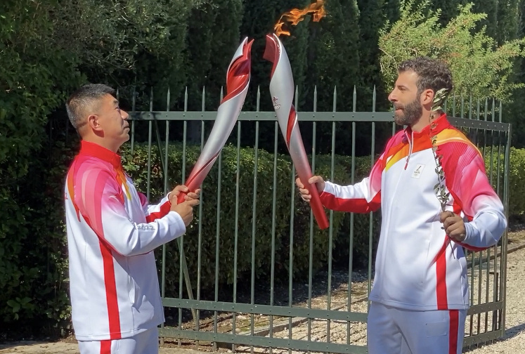 当地时间10月18日正在希腊古奥林匹亚遗址举行的北京冬奥火炬传递活动进入第二棒,担任第二棒火炬手的是中国国家体育总局冬季管理中心训练二部的负责人李佳军。(总台记者 朱赫 王玉国 罗宏涛 耿德林)