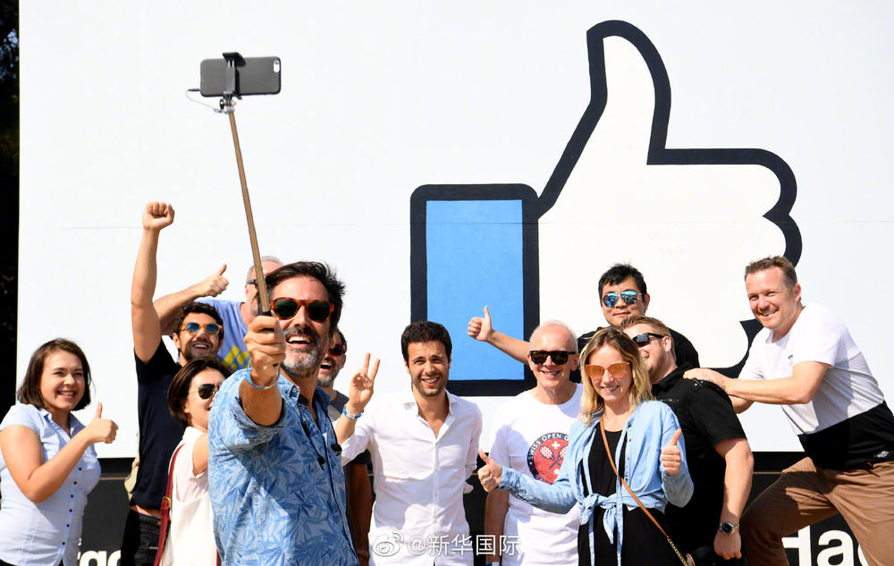 图为2018年8月11日,在美国旧金山湾区,参加“脸书节”的游客在脸书园区标志前合影。