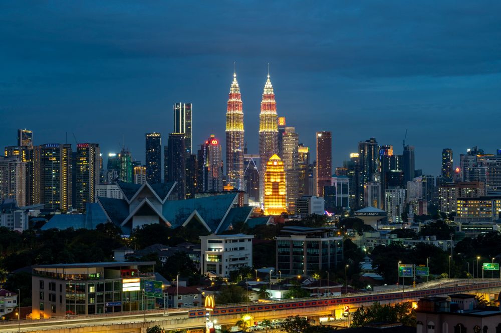 8月31日,位于吉隆坡的马来西亚国家石油公司双塔亮起马来西亚国旗颜色的灯光,庆祝马来西亚独立64周年。(新华社发,张纹综摄)