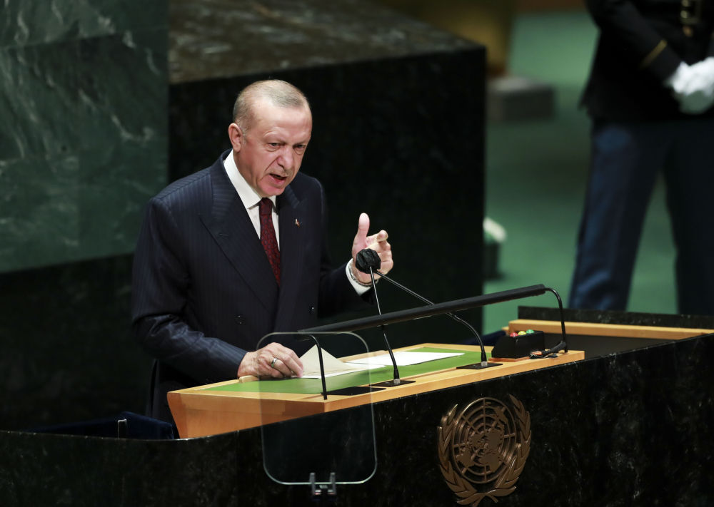 9月21日,在位于纽约的联合国总部,土耳其总统埃尔多安出席第76届联合国大会一般性辩论并进行现场发言。(新华社记者王迎摄)