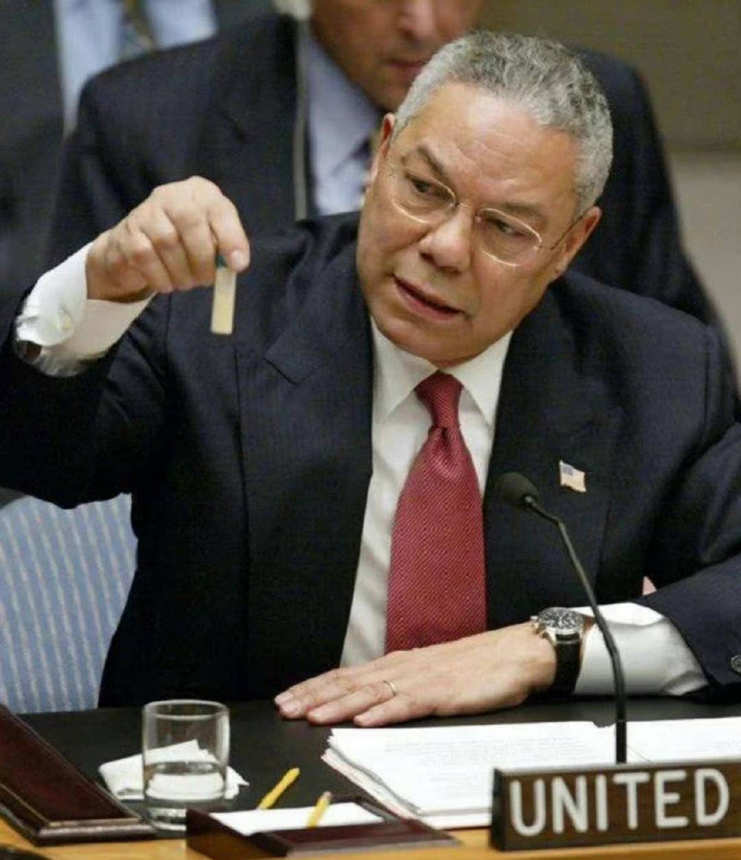 美国2003年指称伊拉克藏匿大规模杀伤性武器,发动伊拉克战争,时任美国国务卿鲍威尔还拿出了一管白色粉末状的东西作为证据。