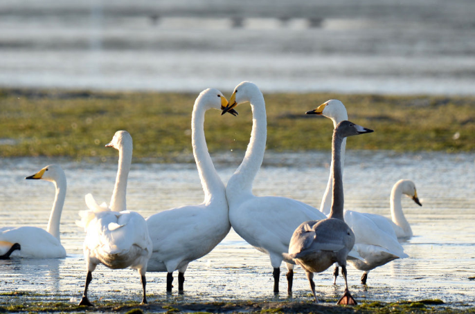 随着气温突降,山东省荣成市陆续迎来上百只“凌波仙子”大天鹅飞抵越冬。