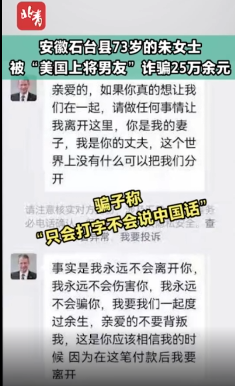 ·安徽一73岁老太被“美国男友”骗25万元,骗子自称在叙利亚打仗。
