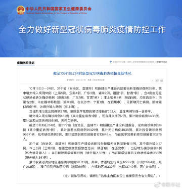 【#10月18日新增确诊病例25例# #10月18日新增本土病例9例#】据国家卫生健康委员会网站,10月18日0—24时,31个省(自治区、直辖市)和新疆生产建设兵团报告新增确诊病例25例。其中境外输入病例16例(上海5例,云南4例,广东3例,湖南2例,福建1例,甘肃1例),含4例由无症状感染者转为确诊病例(湖南2例,广东1例,甘肃1例);本土病例9例(陕西5例,均在西安市;内蒙古2例,均在锡林郭勒盟;湖南1例,在长沙市;宁夏1例,在银川市)。无新增死亡病例。新增疑似病例1例,为境外输入病例(在上海)。