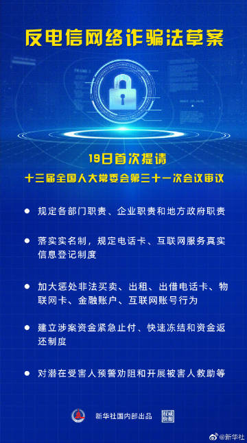 【权威快报|#反电信网络诈骗法草案首次提请审议#】反电信网络诈骗法草案19日首次提请十三届全国人大常委会第三十一次会议审议。草案增强立法针对性、实用性、有效性,全面落实打防管控各项措施,规定反电信网络诈骗各部门职责、企业职责和地方政府职责;落实实名制,规定电话卡、互联网服务真实信息登记制度;加大惩处非法买卖、出租、出借电话卡、物联网卡、金融账户、互联网账号行为;建立涉案资金紧急止付、快速冻结和资金返还制度;对潜在受害人预警劝阻和开展被害人救助等。(记者熊丰,海报设计张晨光)