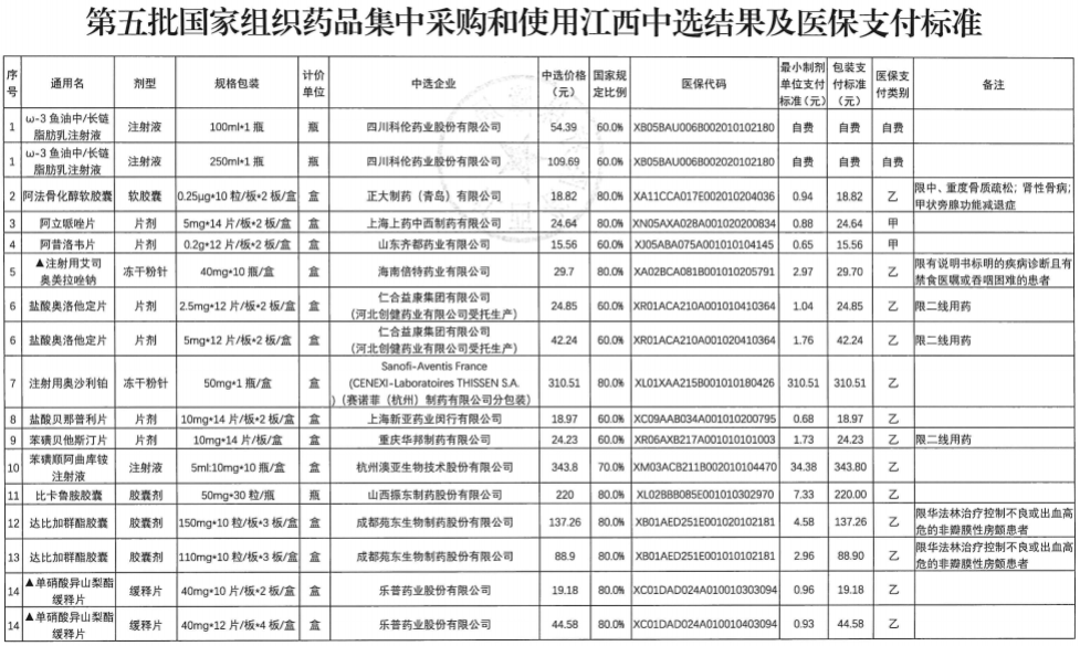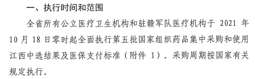 按照《江西省药品医用耗材集中采购联席会议办公室关于执行第五批国家组织药品集中采购和使用中选结果的通知》,江西省所有公立医疗卫生机构和驻赣军队医疗机构,于2021年10月18日零时起,全面执行第五批国家组织药品集中采购和使用江西中选结果及医保支付标准。为做好第五批国家组织药品集中采购中选药品落地执行工作,保障医疗机构及时采购供应中选药品,经研究,决定于2021年10月17日零时起提前开放中选药品网上采购资格。请各有关药品生产经营企业和医疗机构及时登录江西省医药采购服务平台,开展第五批国家组织药品集中采购中选药品网上采购工作。