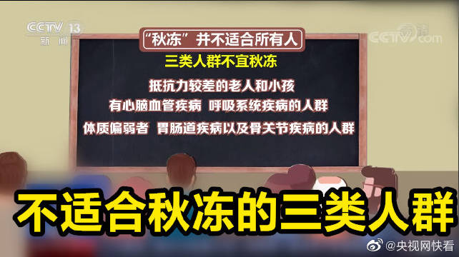 【#秋冻适合所有人吗#?】俗话说“春捂秋冻”,那么到底应该怎么“冻”才科学呢?据中国天气网报道,首先,秋冻要根据气温适当加衣服,并以能承受的寒冷为度,一旦气温明显下降,要及时添加衣物,以免疾病发生。其次,#三类人群不宜秋冻#:①抵抗力较差的老人和小孩②有心脑血管疾病、呼吸系统疾病的人群③体质偏弱者、胃肠道疾病以及骨关节疾病的人群。央视网快看的微博视频