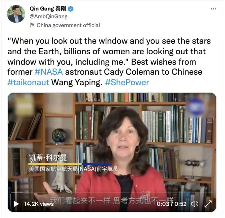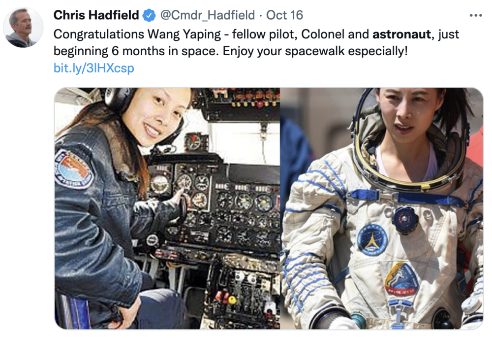 前加拿大航天局宇航员克里斯·哈德菲尔德转发了王亚平执行任务时的照片,并留言说:“祝贺王亚平开启6个月的太空之旅。特别是,享受你的太空漫步吧!”