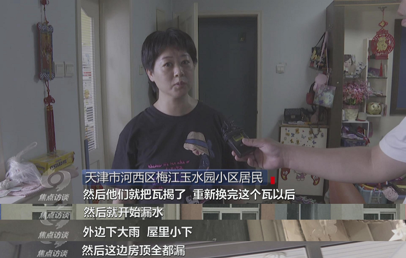 2018年,河西区做老旧小区改造工程,梅江玉水园小区的屋顶防水列入改造。工程于2018年4月开工。当年9月,改造工程竣工验收后,部分房屋却一直有漏雨的情况。