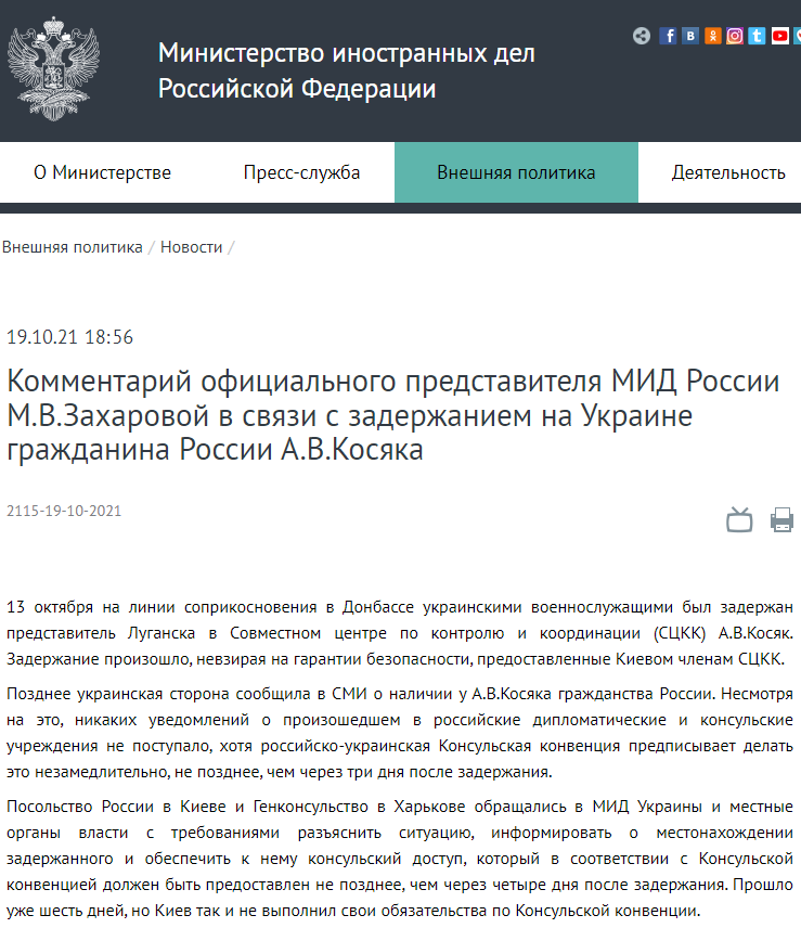 俄罗斯外交部新闻发言人扎哈罗娃当地时间10月19日表示,13日乌克兰军队在顿巴斯地区拘留了一名俄罗斯国籍公民。她表示这是对俄罗斯的挑衅行为,这个事件不仅会破坏顿巴斯地区的和平进程,更违反了乌克兰和俄罗斯签署的双边领事公约。她呼吁乌克兰方面停止在顿巴斯地区的挑衅,尽快告知俄罗斯被拘留公民的下落,并让俄罗斯外交领事官员与他会面。(总台记者 徐鸿波)