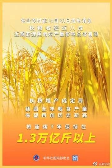 【权威快报|农业农村部:#秋粮增产已成定局#】据农业农村部10月20日消息,目前秋粮收获近八成,近期的连阴雨对产量影响总体有限,秋粮增产已成定局。#全年粮食产量有望再创历史新高#,将连续7年保持在1.3万亿斤以上。(记者于文静、胡璐,海报设计杨轶群)