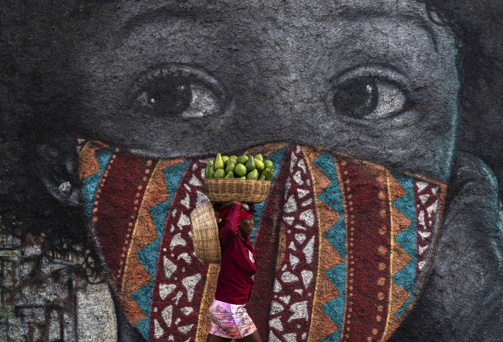 8月24日,一名女子头顶水果走在海地太子港街头。(新华社发,戴维·德拉帕斯摄)