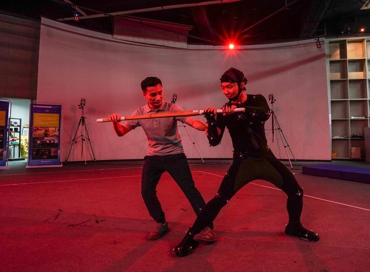 6月11日,在金陵科技学院动漫学院动作捕捉实验室,教师叶骁郁(左)在指导学生进行动作捕捉课程实践。新华社记者李博摄