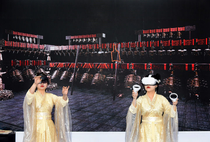 5月21日,工作人员在中国高等教育博览会上通过VR技术演奏古代编钟乐曲。新华社记者李紫恒摄