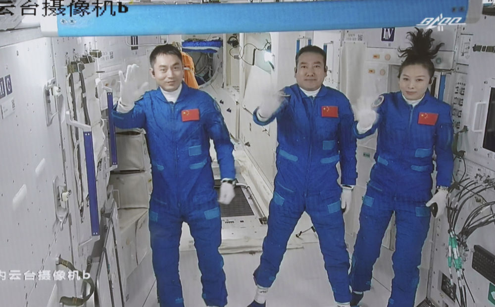 10月16日在北京航天飞行控制中心拍摄的进驻天和核心舱的航天员翟志刚(中)、王亚平(右)、叶光富向全国人民挥手致意的画面。(新华社记者田定宇摄)