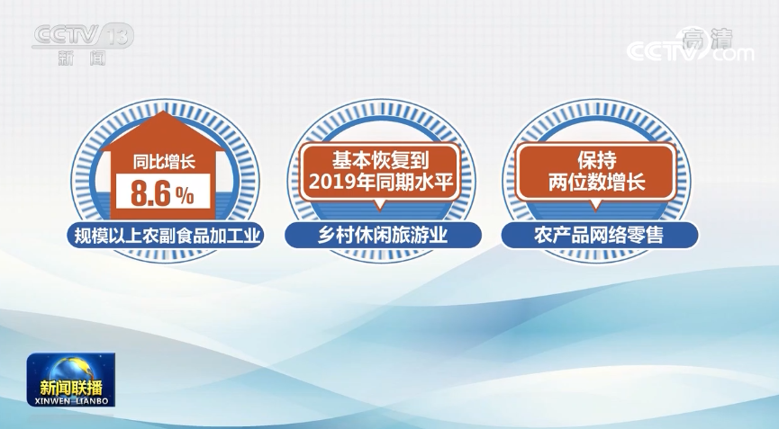 前三季度,“菜篮子”产品供应充足,生猪生产全面恢复。乡村富民产业发展势头良好,规模以上农副食品加工业同比增长8.6%,乡村休闲旅游业基本恢复到2019年同期水平,农产品网络零售保持两位数增长。