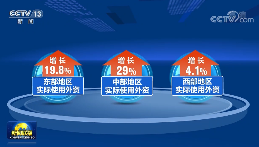 从区域分布看,我国东部、中部、西部地区实际使用外资分别增长19.8%、29%和4.1%。