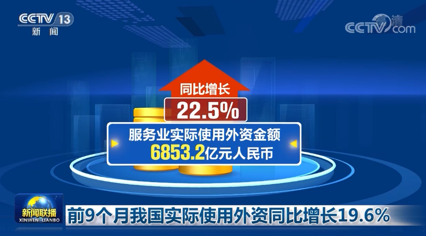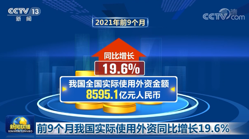 央视网消息(新闻联播):商务部今天(10月20日)发布的数据显示,今年前9个月,我国全国实际使用外资金额8595.1亿元人民币,同比增长19.6%。