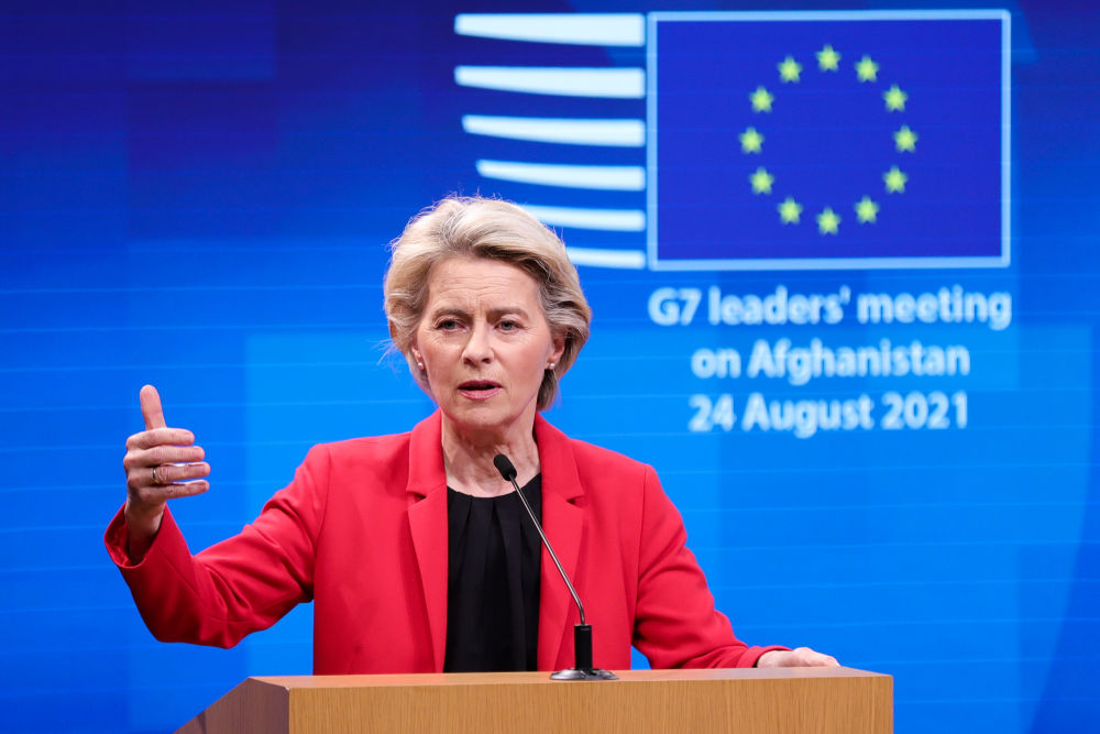 8月24日,在比利时布鲁塞尔,欧盟委员会主席冯德莱恩在记者会上发言。(新华社记者郑焕松摄)