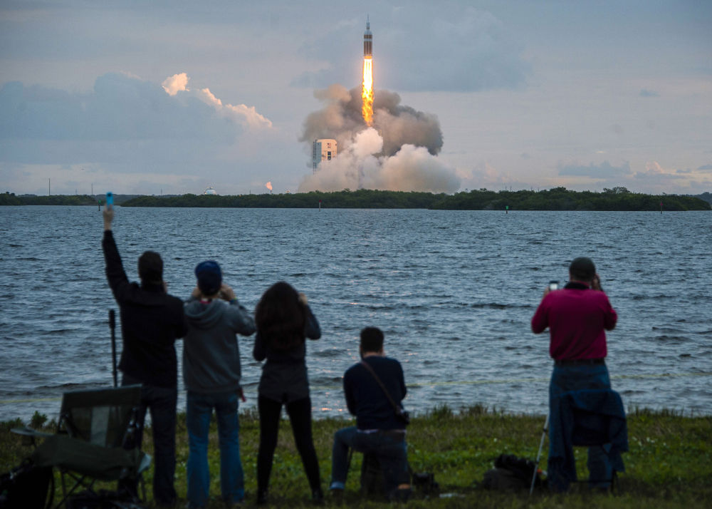 2014年12月5日,人们观看搭载“猎户座”飞船的“德尔塔”-4重型火箭从美国佛罗里达州肯尼迪航天中心升空。(新华社/美联)