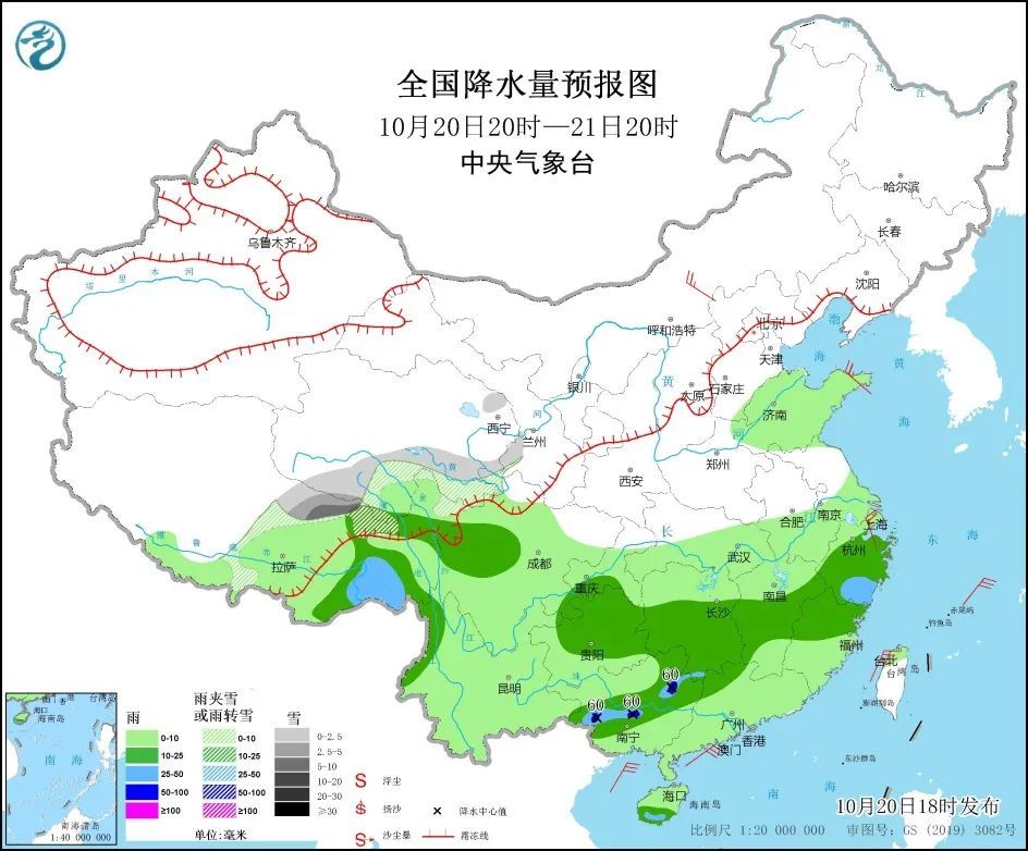 20日20时至21日20时,西藏中东部、青海南部等地部分地区雨夹雪,其中西藏北部和青海南部局地有小到中雪,局地大雪。西藏东南部、江南大部、西南地区北部和东南部、广西中部和东北部等地部分地区有中到大雨,其中,广西中部局地有暴雨。