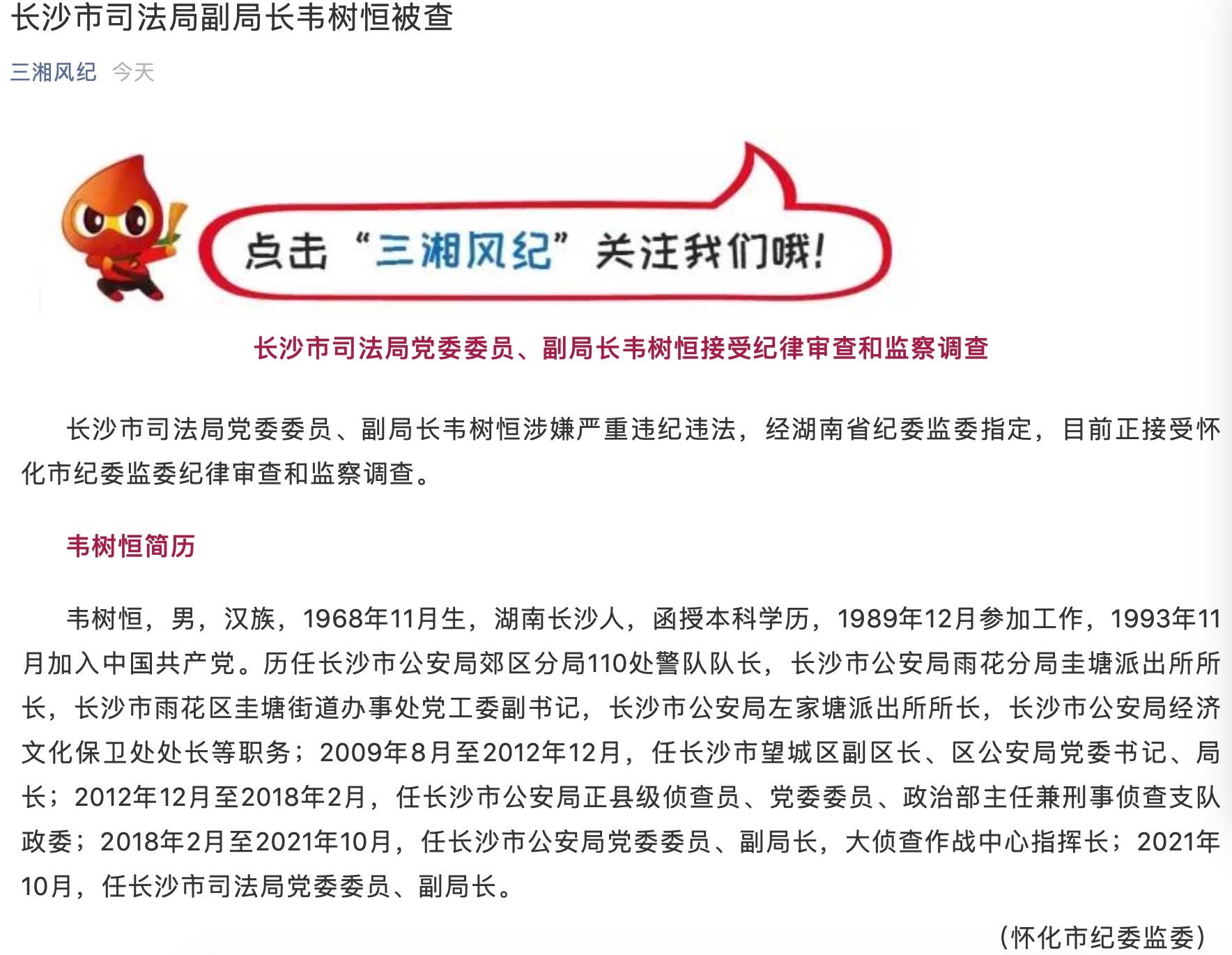 湖南省纪律监察委员会官方微信“三湘风纪”10月21日通报,长沙市司法局党委委员、副局长韦树恒接受纪律审查和监察调查。
