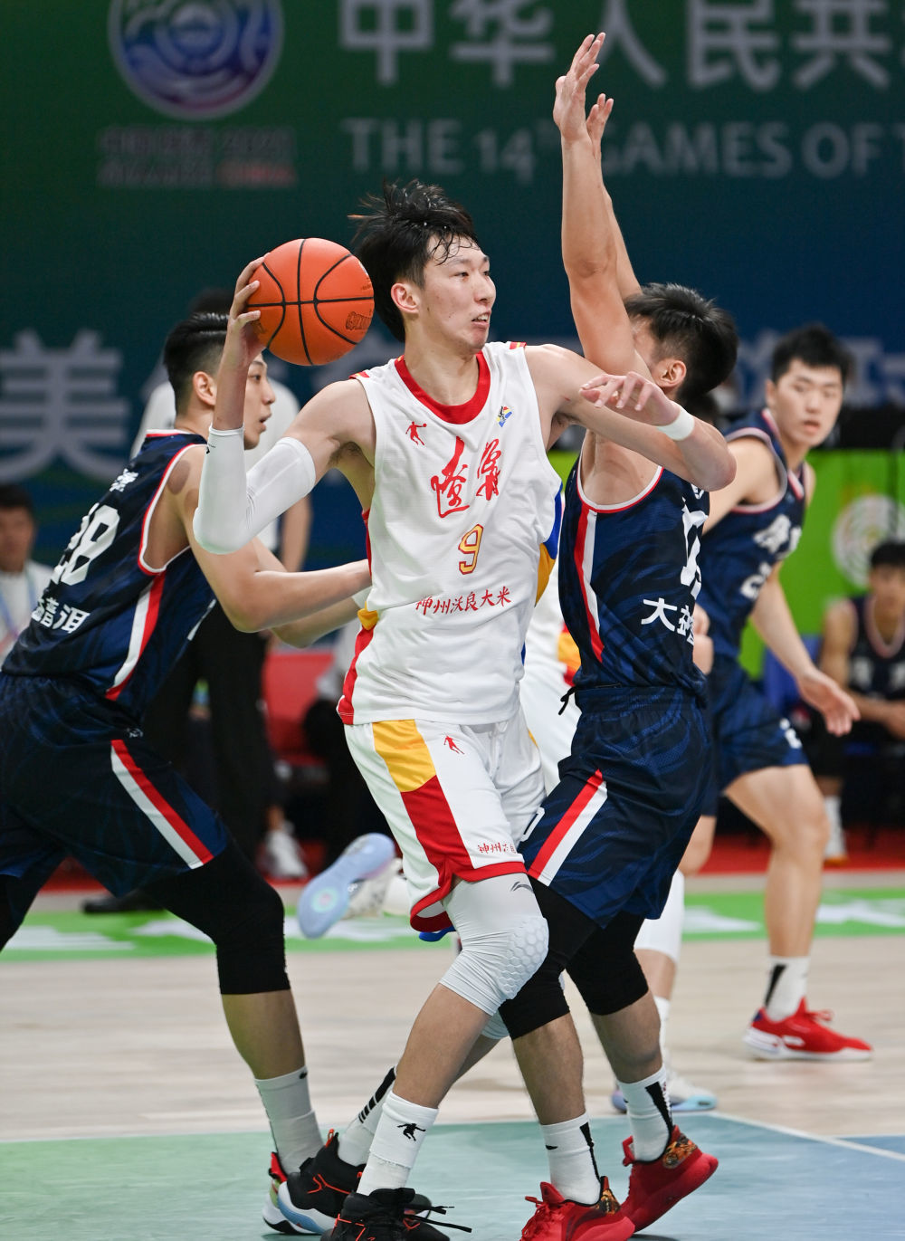 9月26日,辽宁队球员周琦(中)在比赛中。当日,在陕西铜川举行的第十四届全运会五人制篮球男子22岁以下组决赛中,辽宁队以87比79战胜广东队,获得金牌。新华社记者孙凡越摄