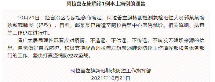 据直通阿拉善左旗微信公众号消息,10月21日,经自治区专家组会商确定,阿拉善左旗核酸检测复检阳性人员郭某某确诊新冠肺炎(轻型),目前,郭某某已转运至阿拉善盟中心医院就诊。相关流调、排查等工作仍在进行中。