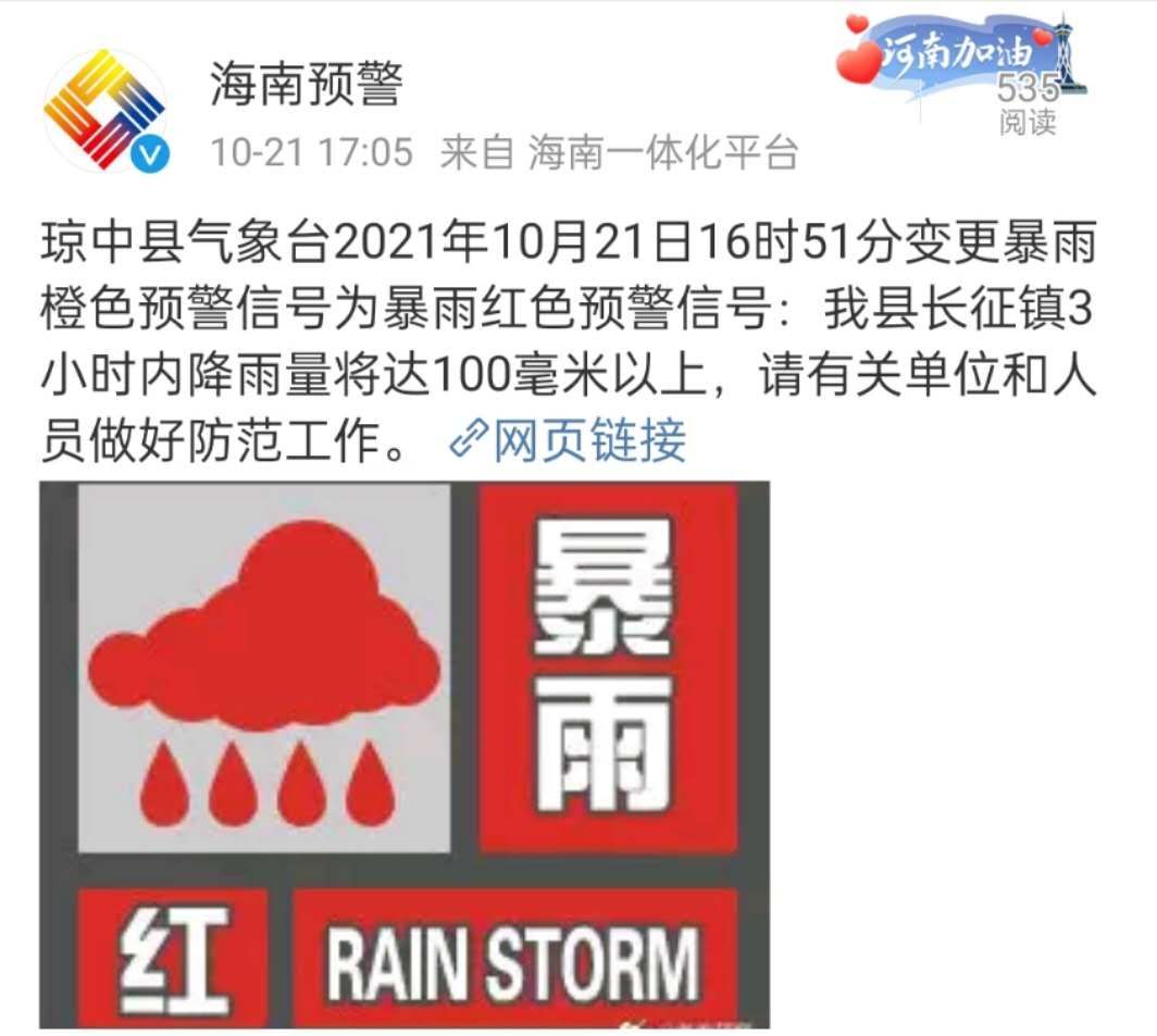 据琼中县气象部门21日的预报,琼中县长征镇3小时内降雨量将达100毫米以上,琼中县气象台2021年10月21日16时51分变更暴雨橙色预警信号为暴雨红色预警信号。