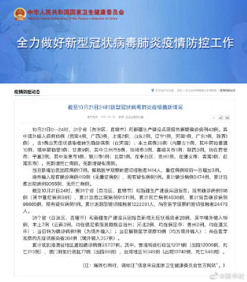 截至10月21日24时,据31个省(自治区、直辖市)和新疆生产建设兵团报告,现有确诊病例518例(其中重症病例3例),累计治愈出院病例91511例,累计死亡病例4636例,累计报告确诊病例96665例,现有疑似病例1例。累计追踪到密切接触者1222061人,尚在医学观察的密切接触者24473人。