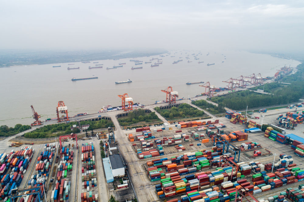 这是10月19日拍摄的武汉阳逻港一期码头(无人机照片)。当日,“江海直达19”货轮抵达武汉阳逻港。货轮成功首航,标志着武汉成功打通了出海的外贸新通道。(新华社发,伍志尊摄)