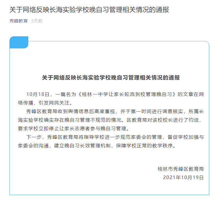 桂林市秀峰区教育局发布《关于网络反映长海实验学校晚自习管理相关情况的通报》:约谈校长,要求学校立即停止让家长志愿者参与晚自习管理。