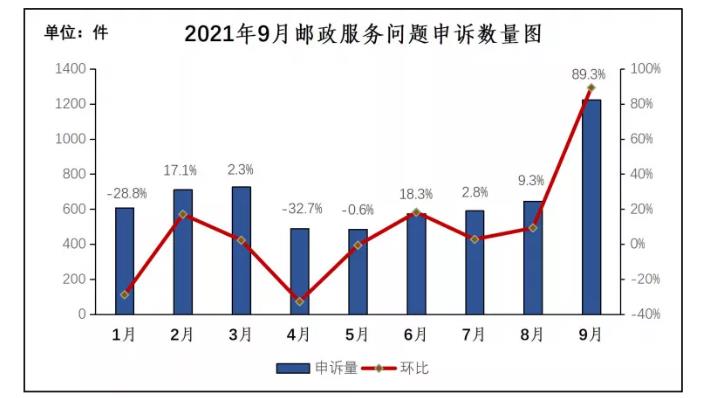 用户对邮政服务问题申诉1223件,环比增长89.3%,同比增长15.5%。