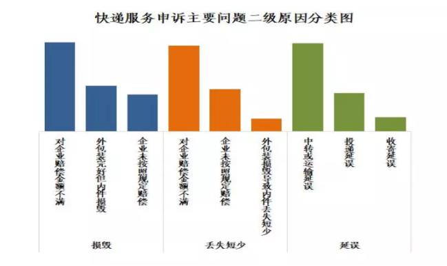快件损毁申诉中主要占比是对企业赔偿金额不满,快件丢失短少申诉中主要占比是对企业赔偿金额不满,快件延误申诉中主要占比是中转或运输延误。